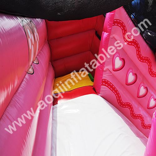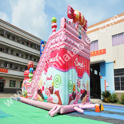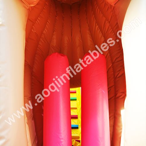 Look at inflatable walls and rails that surround sweet candies with full digital printing. It makes the slide different and refreshing, but that also costs us a lot. If you focus on more details of slide, you will find we make PVC strip for protection at the entrance of slide. At the bottom of candy jars and columns, we use internal PVC strip for bearing area. On access areas, we make webbing on both outside and inside to reinforce, so that those points can hold together better and last for years.